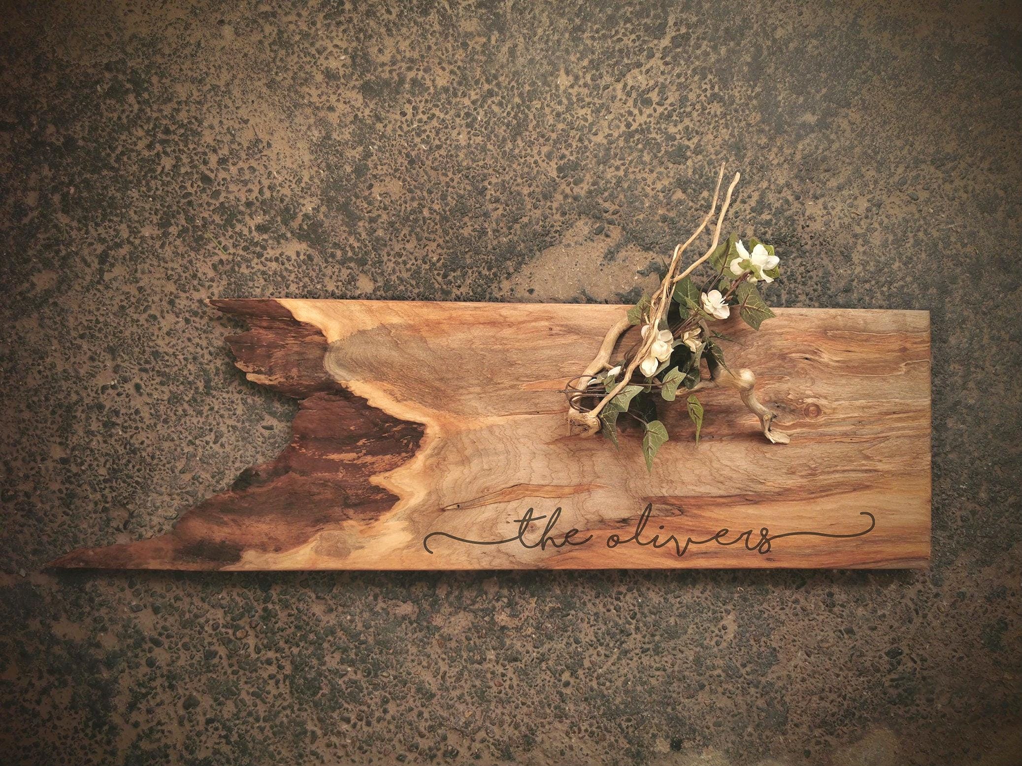 PERSONALIZED LIVE EDGE MAPLE CUTTING BOARD shown with photoshopped FAMILY NAME in SHORELINE SCRIPT design. We can modify this design upon request or provide us with a link for one of our other designs that you would prefer.