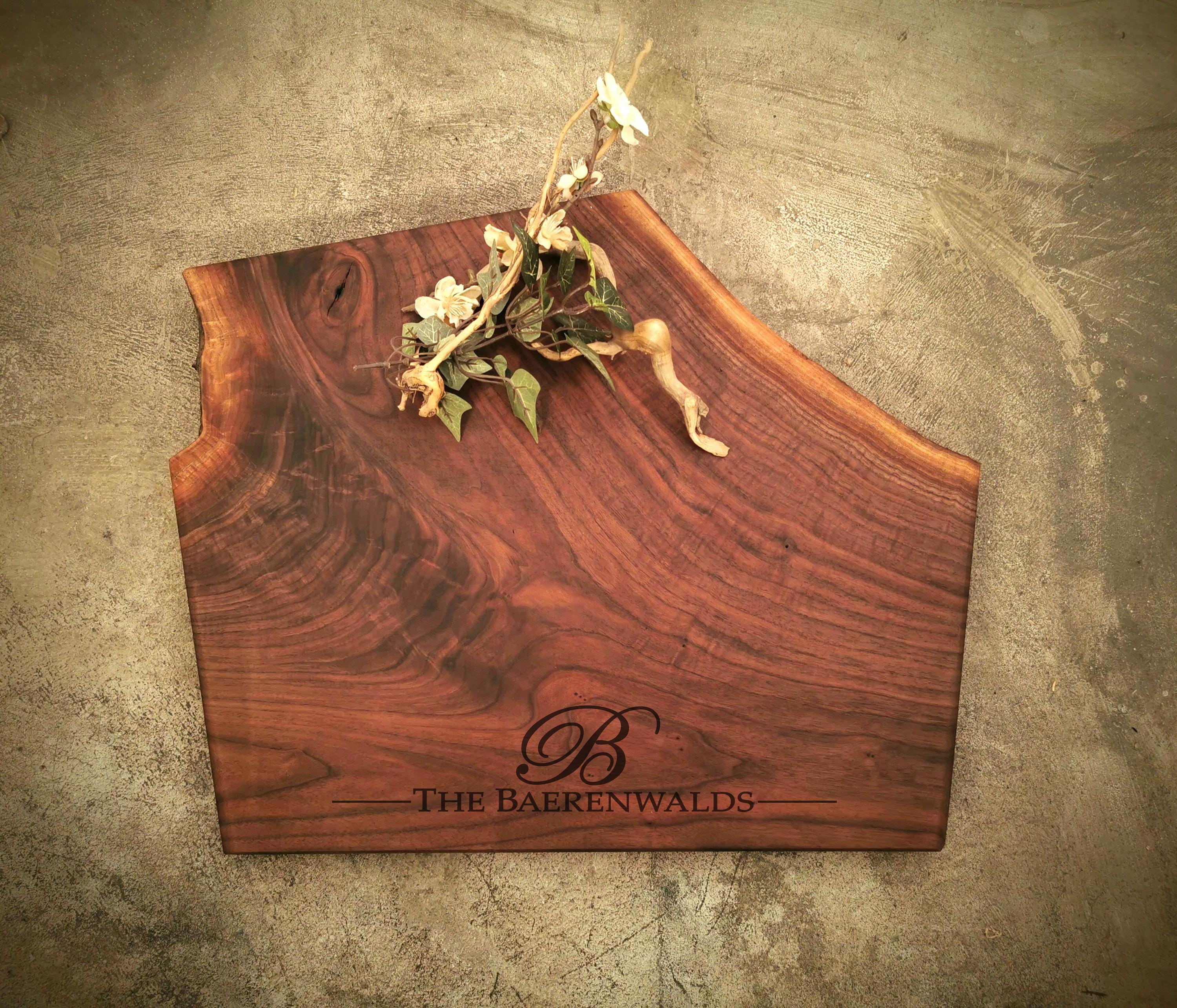 LARGE PERSONALIZED LIVE EDGE BLACK WALNUT CHEESE BOARD with FEET and OSO WOOD BUTTER shown with photoshopped FAMILY NAME and INITIAL. We can substitute with any laser engraved personalization of your choice (see our other personalized board examples for ideas).