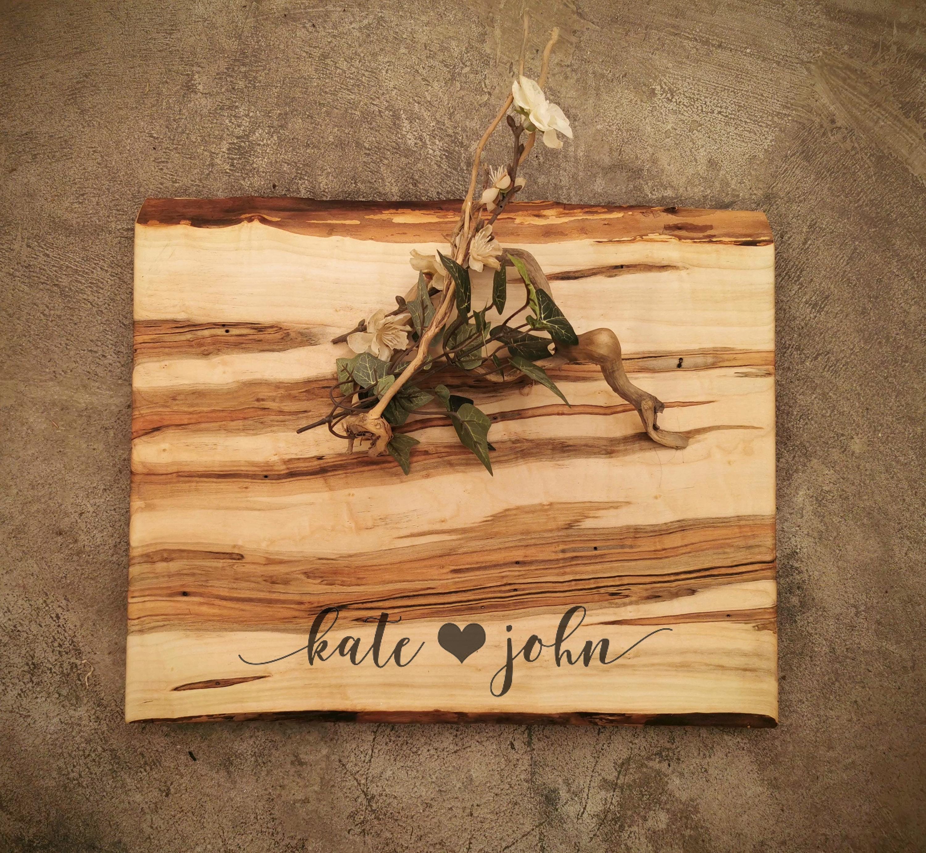 LARGE PERSONALIZED LIVE EDGE MAPLE CUTTING BOARD shown with photoshopped FIRST NAMES and HEART design. We can modify this design upon request or provide us with a link for one of our other designs that you would prefer.