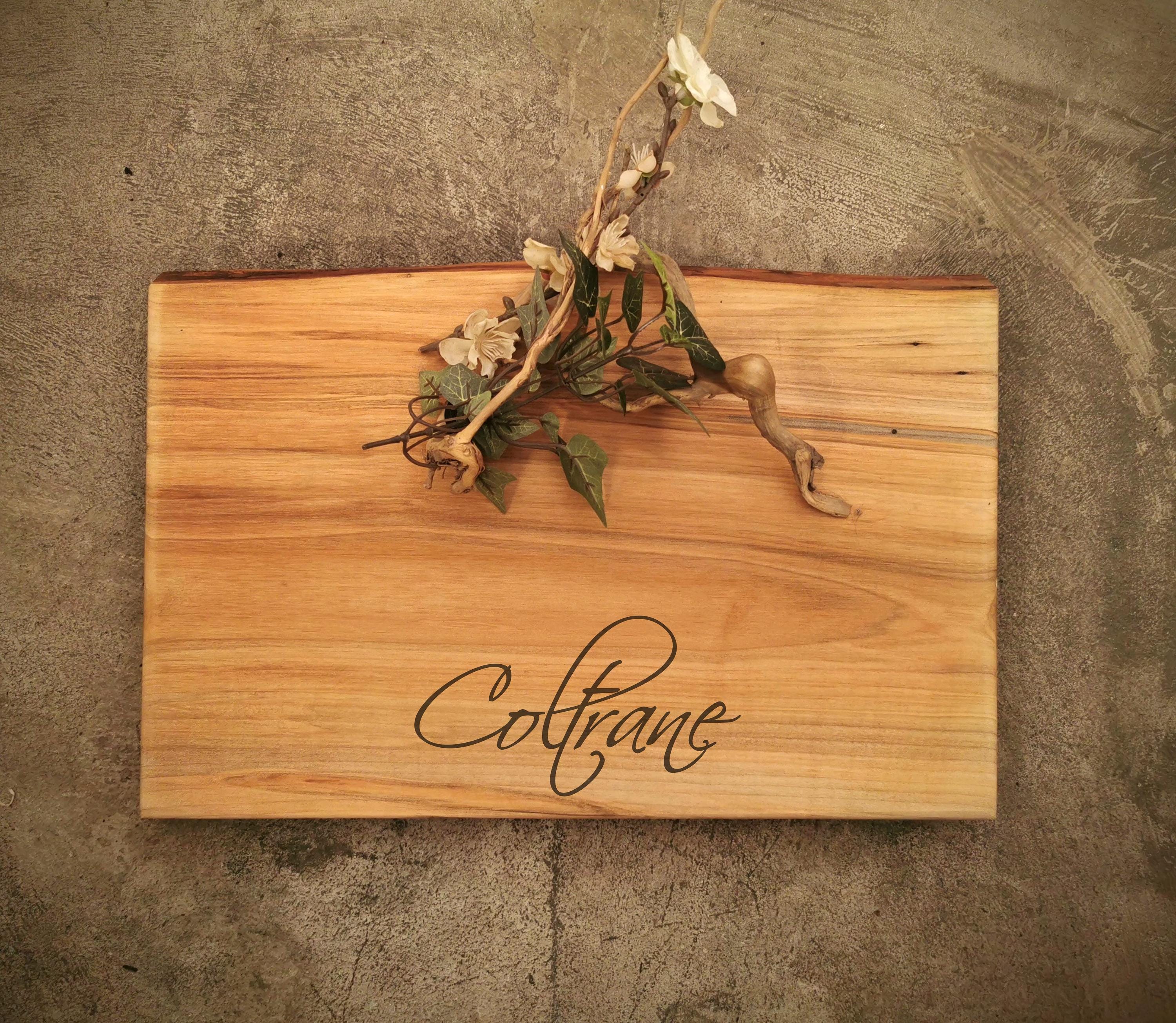 PERSONALIZED LIVE EDGE MAPLE CHEESE BOARD with FEET and OSO WOOD BUTTER shown with photoshopped FAMILY NAME in Scriptina Font. We can modify the design or substitute with any laser engraved personalization of your choice (see our other personalized board examples for ideas).