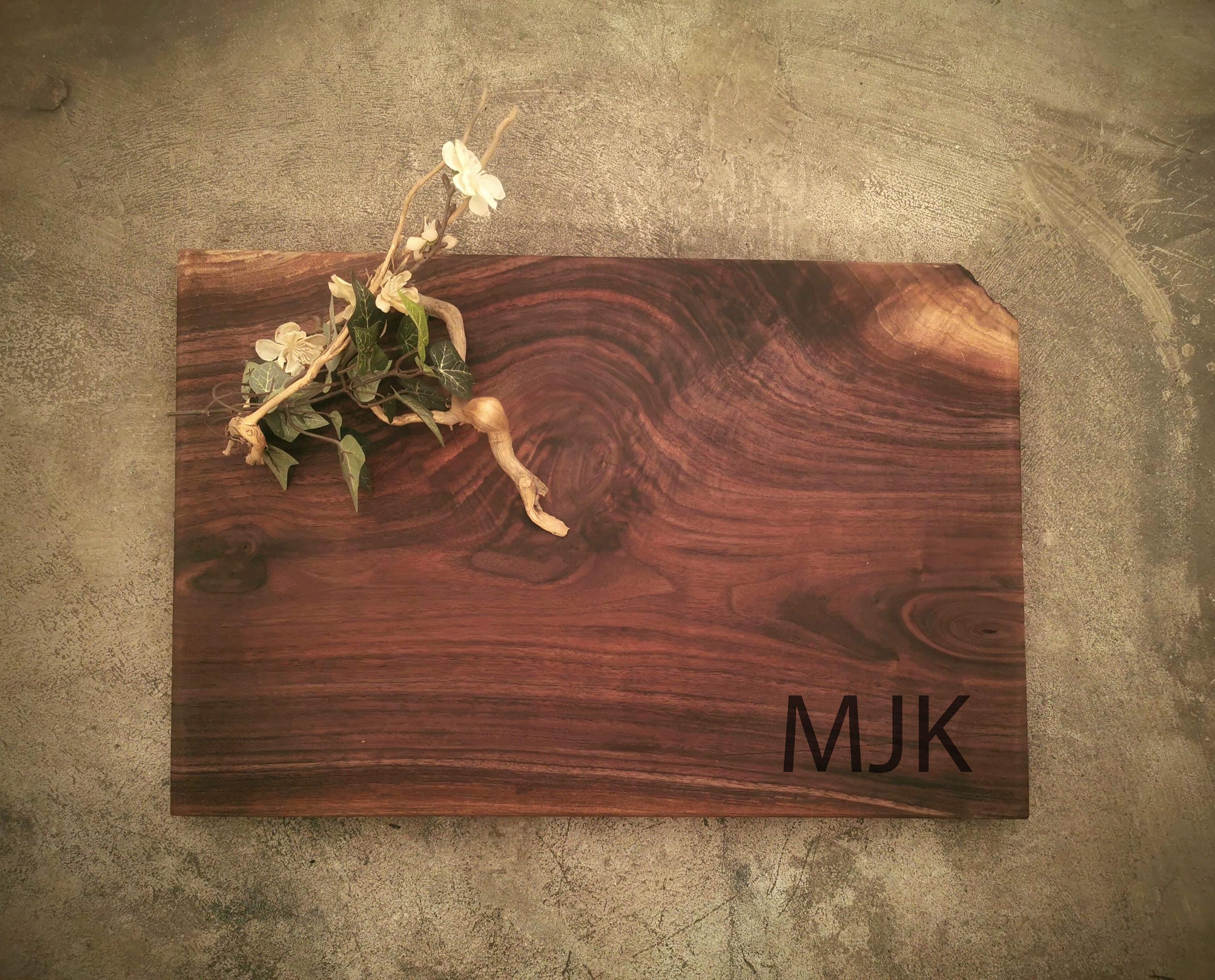 PERSONALIZED BLACK WALNUT CUTTING BOARD with FEET and OSO WOOD BUTTER shown with photoshopped BOLD INITIALS design. We can substitute with any laser engraved personalization of your choice (see our other personalized board examples for ideas).