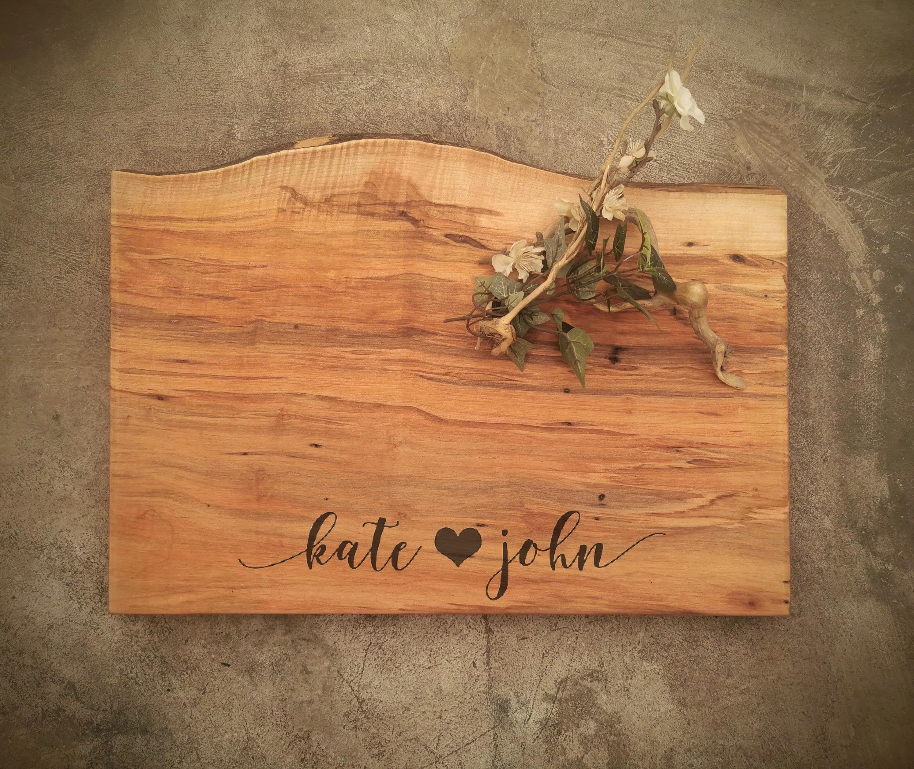 LARGE PERSONALIZED LIVE EDGE MAPLE CUTTING BOARD shown with photoshopped FIRST NAMES and HEART design. We can modify this design upon request or provide us with a link for one of our other designs that you would prefer.