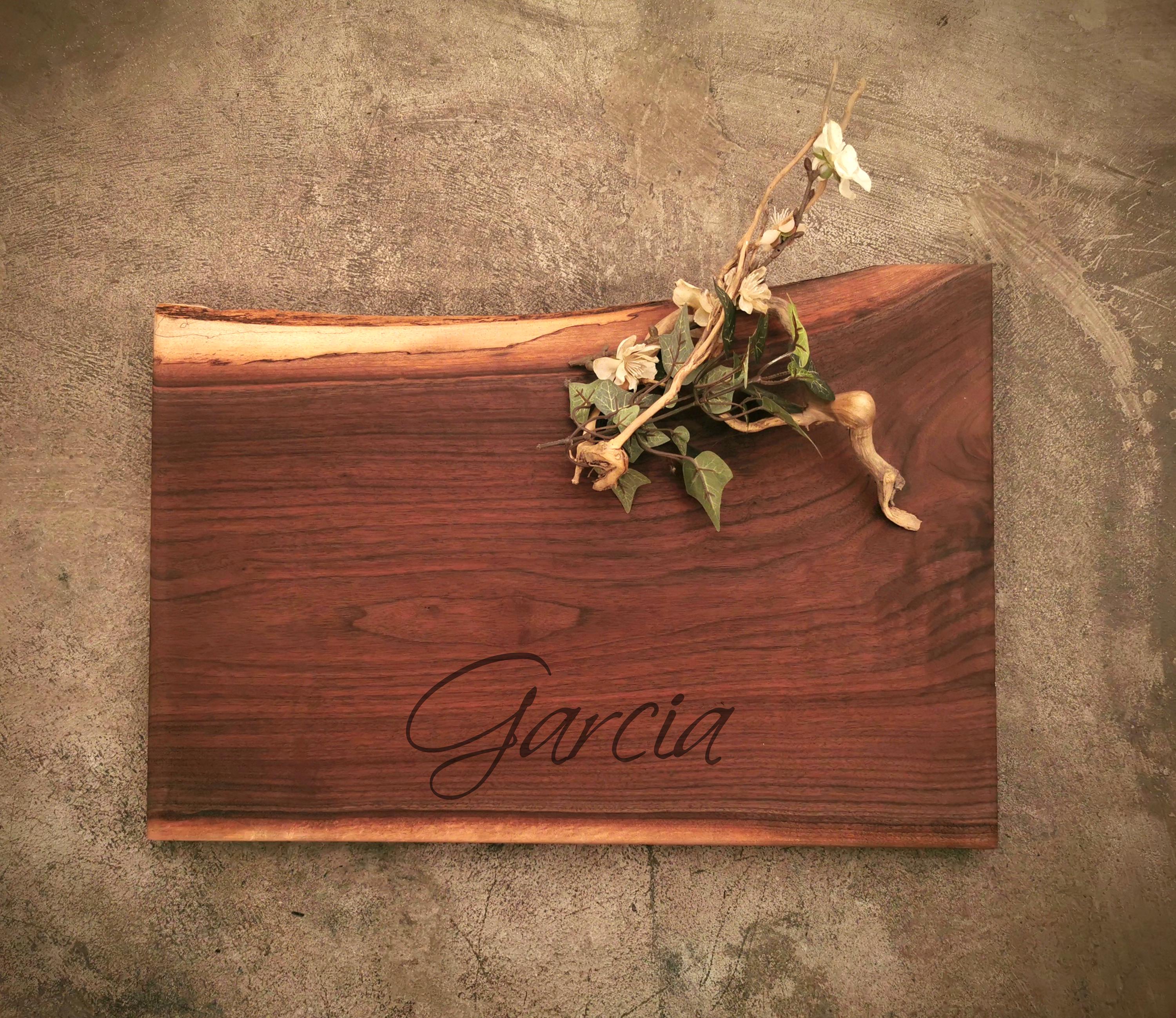 LARGE PERSONALIZED LIVE EDGE BLACK WALNUT CHEESE BOARD with FEET and OSO WOOD BUTTER shown with photoshopped FAMILY NAME in Scriptina script. We can substitute with any laser engraved personalization of your choice (see our other personalized board examples for ideas).