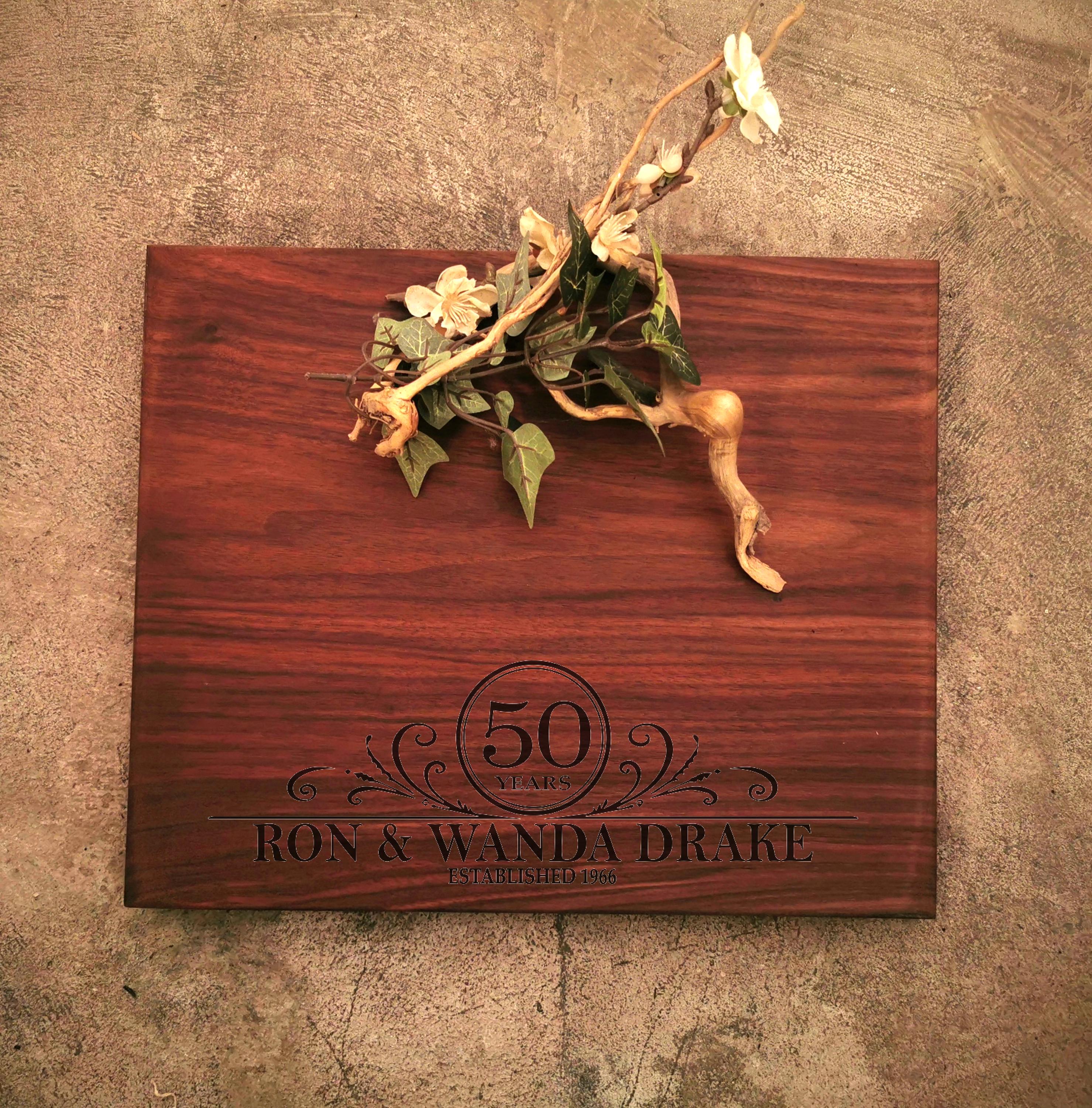 PERSONALIZED BLACK WALNUT CUTTING BOARD with FEET and OSO WOOD BUTTER shown with photoshopped ANNIVERSARY design (we can do any year). We can substitute with any laser engraved personalization of your choice (see our other personalized board examples for ideas).
