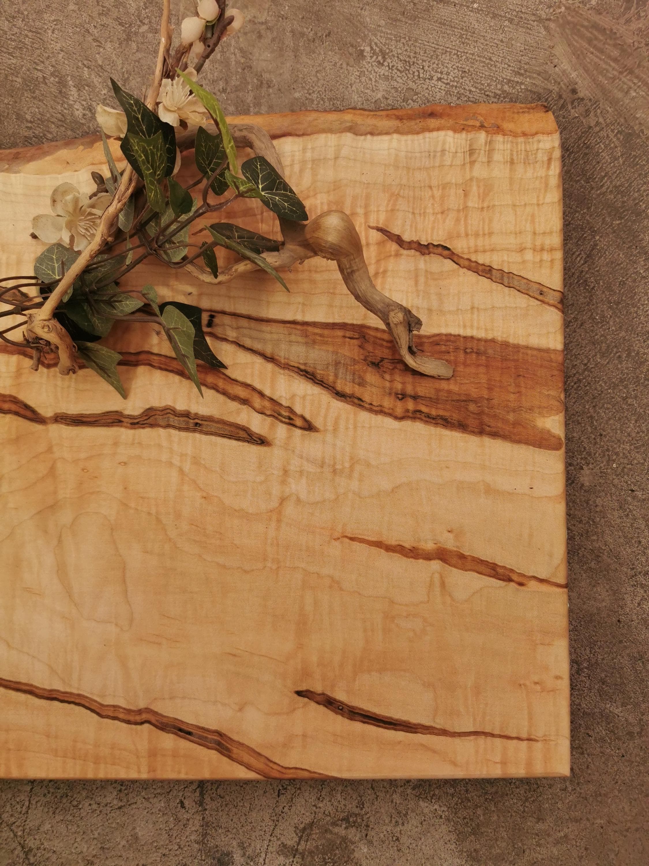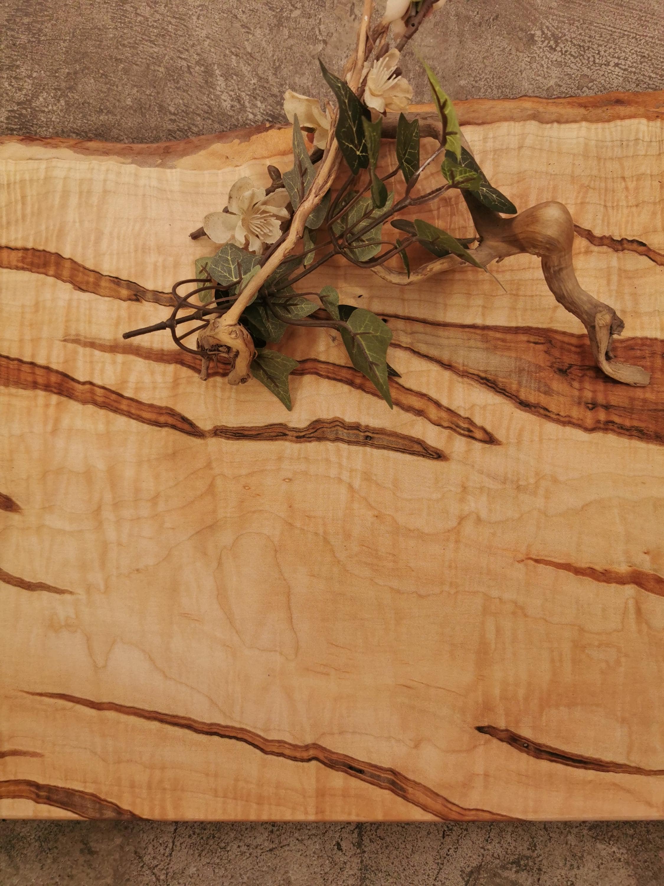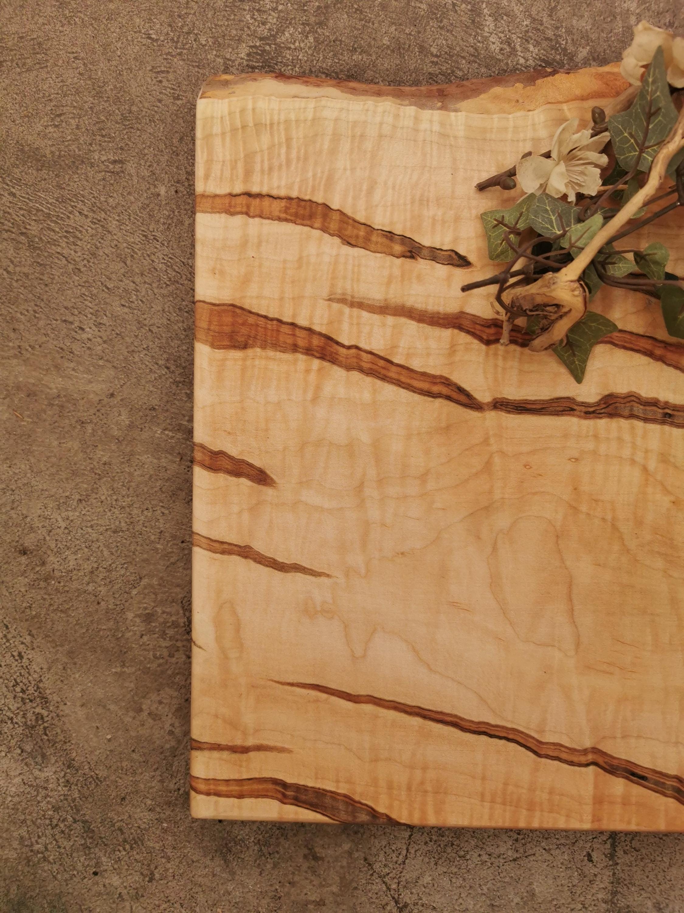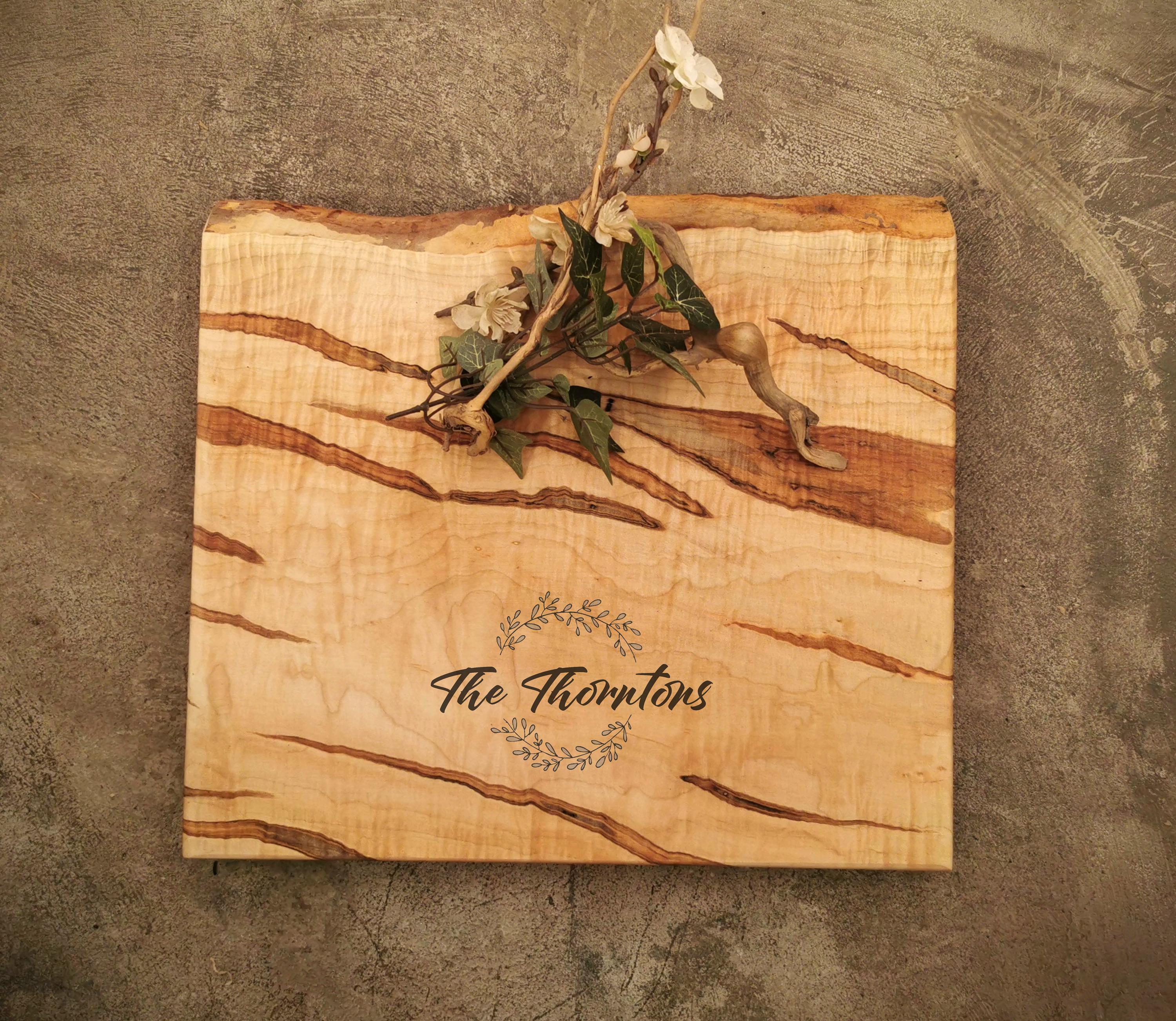 PERSONALIZED LIVE EDGE MAPLE CUTTING BOARD shown with photoshopped FAMILY NAME in SPLIT WREATH design. We can modify this design upon request or provide us with a link for one of our other designs that you would prefer.