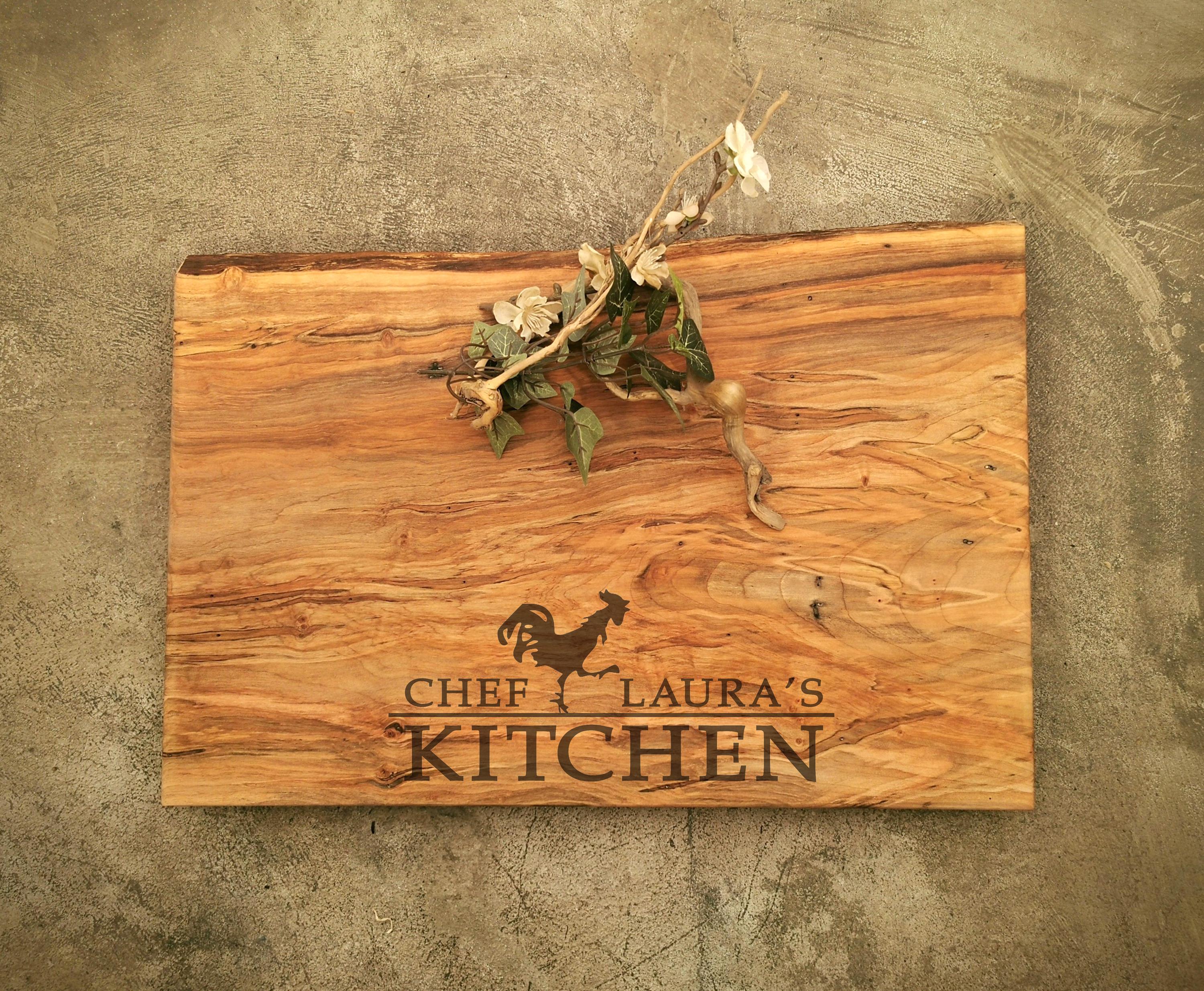 PERSONALIZED LIVE EDGE MAPLE CHEESE BOARD with FEET and OSO WOOD BUTTER shown with photoshopped CHEF and CHICKEN design. We can modify the design or substitute with any laser engraved personalization of your choice (see our other personalized board examples for ideas).