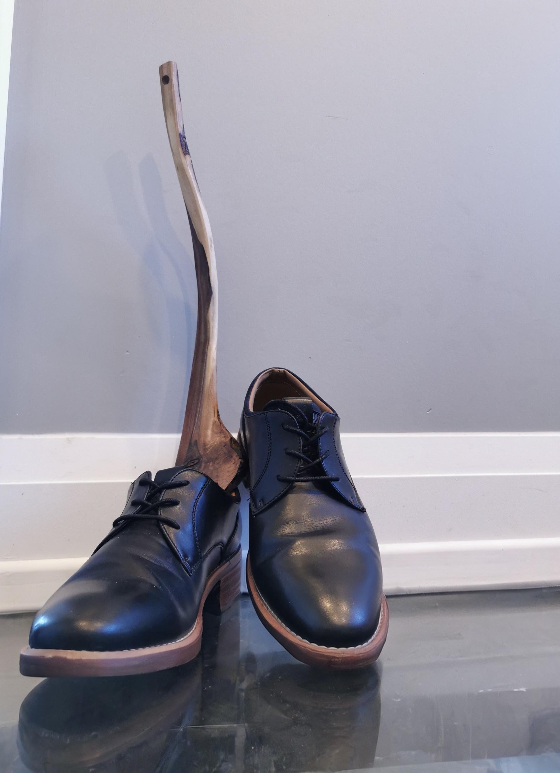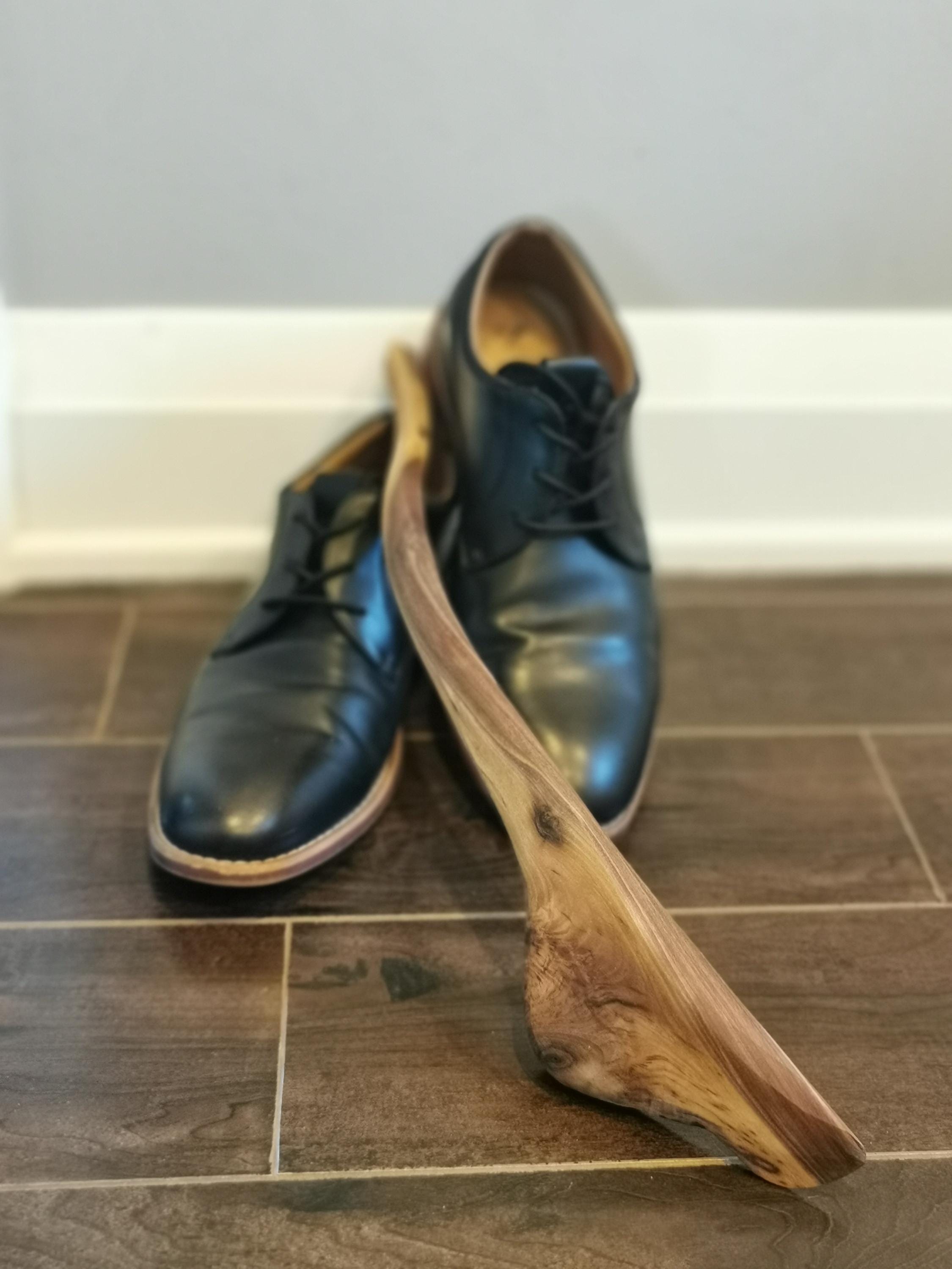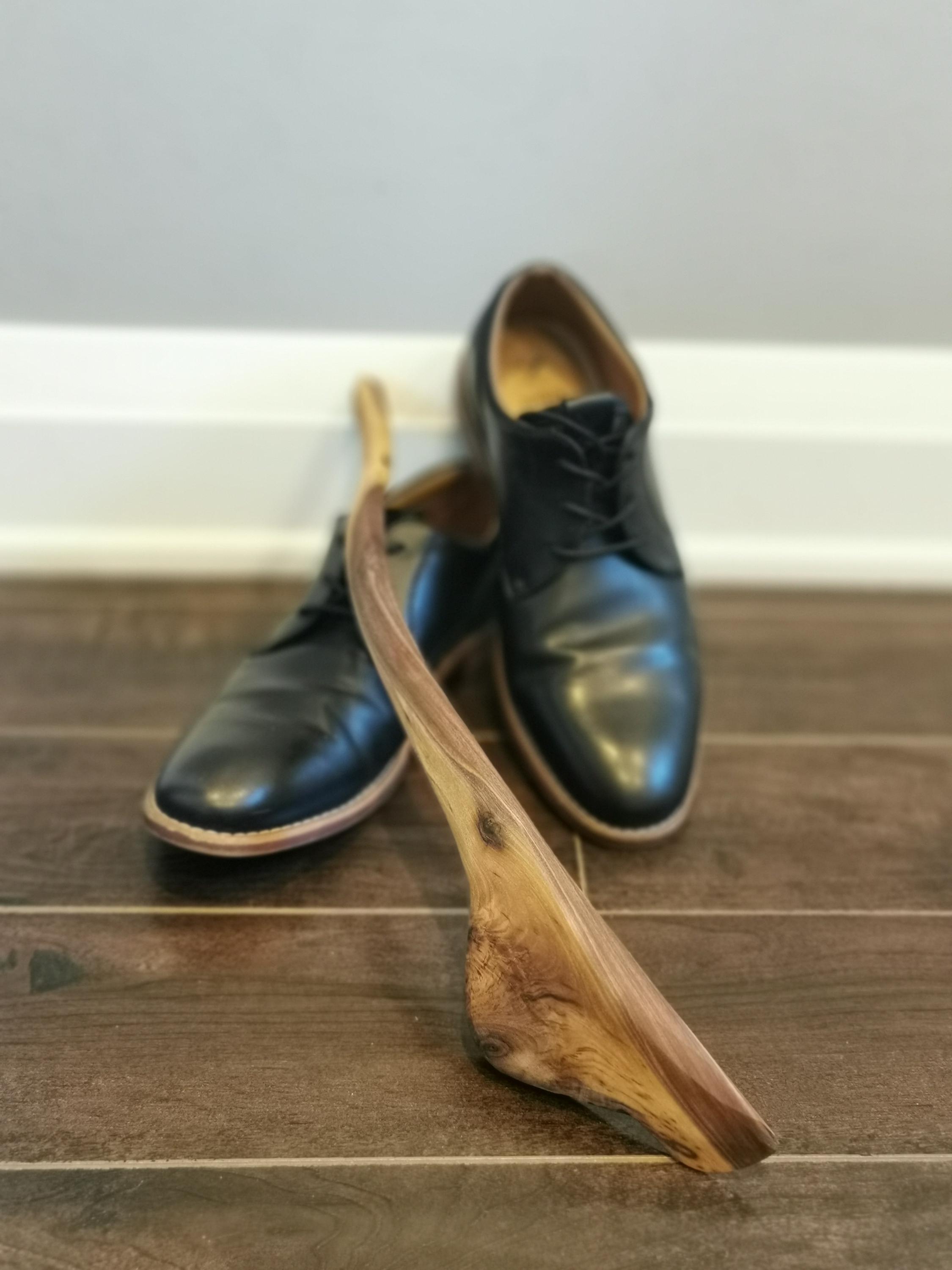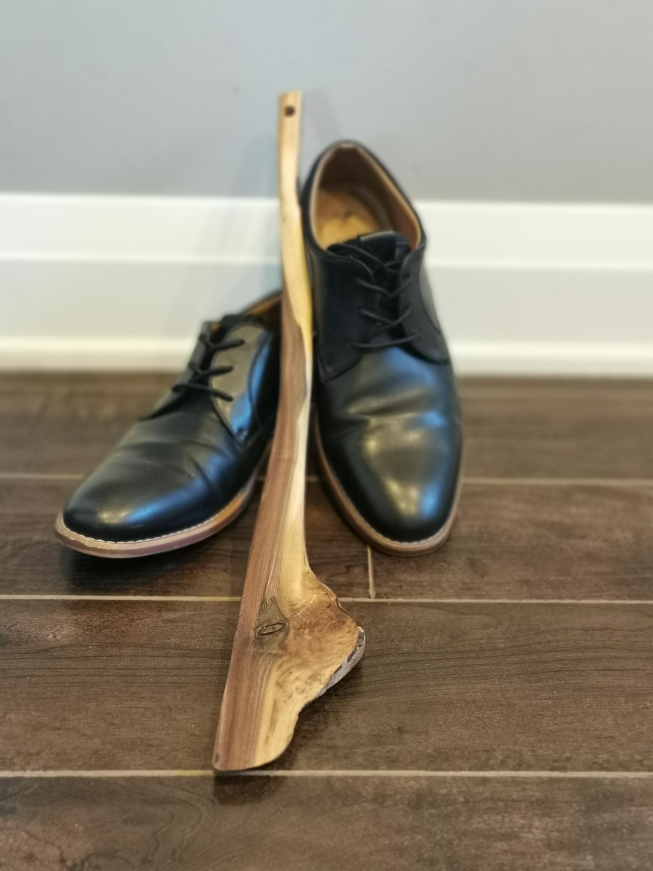 Handmade walnut shoehorn, full of character and natural beauty. The curve in this one feels like you're changing gears when you use it. Includes a handmade wooden holder for hanging on the wall, a beautiful sculptural piece. All of our products are made from ethically and locally sourced lumber and crafted by hand in our workshop.