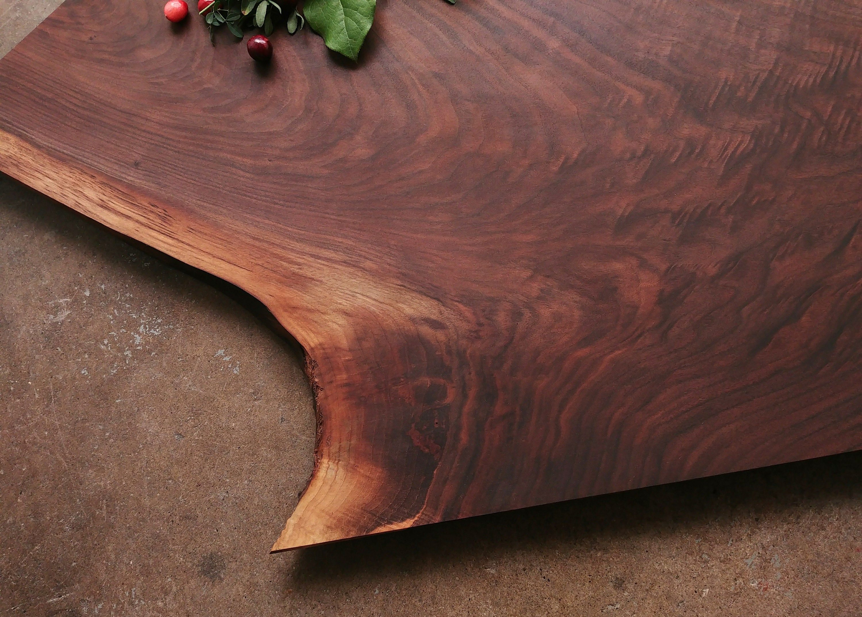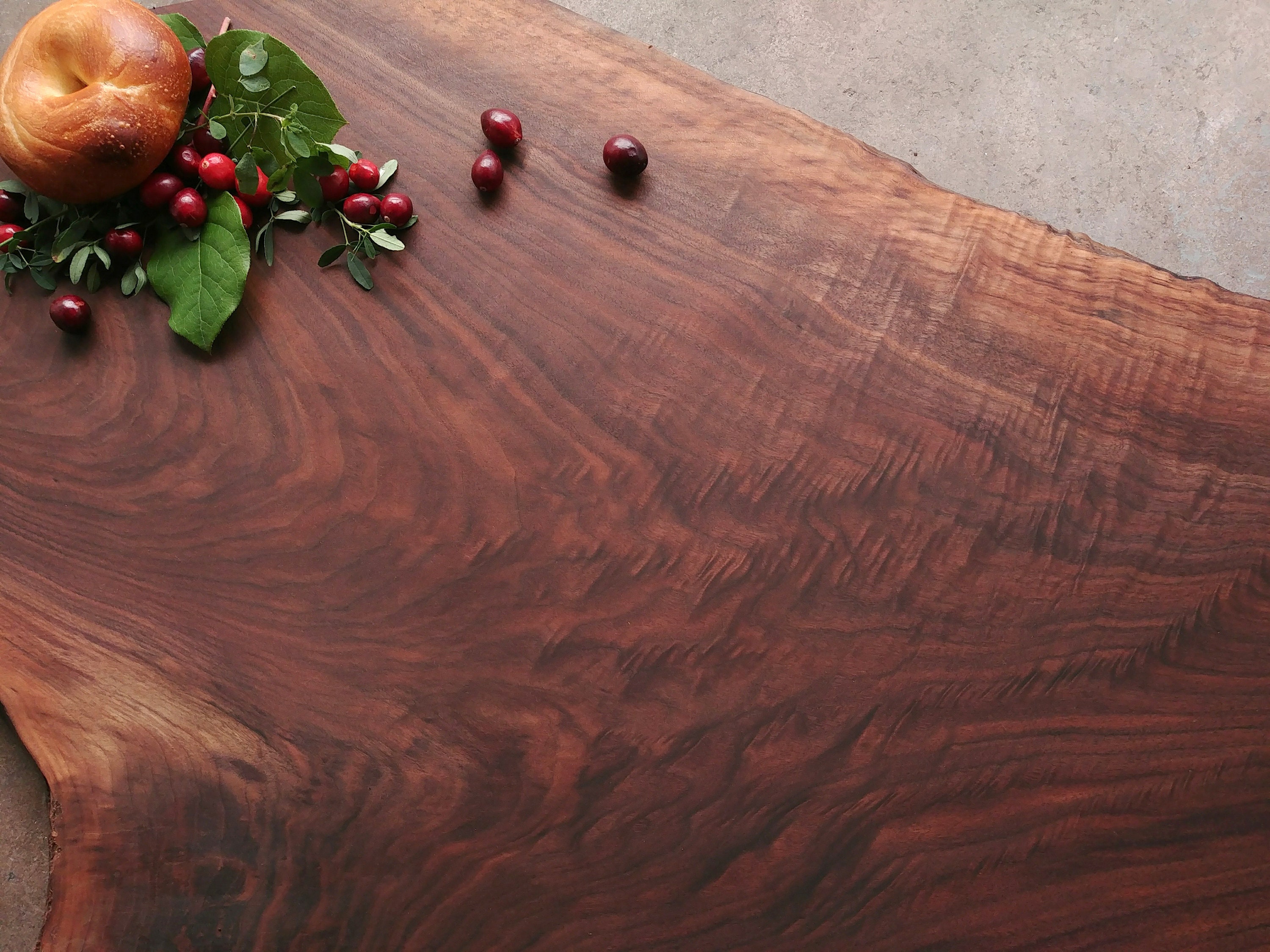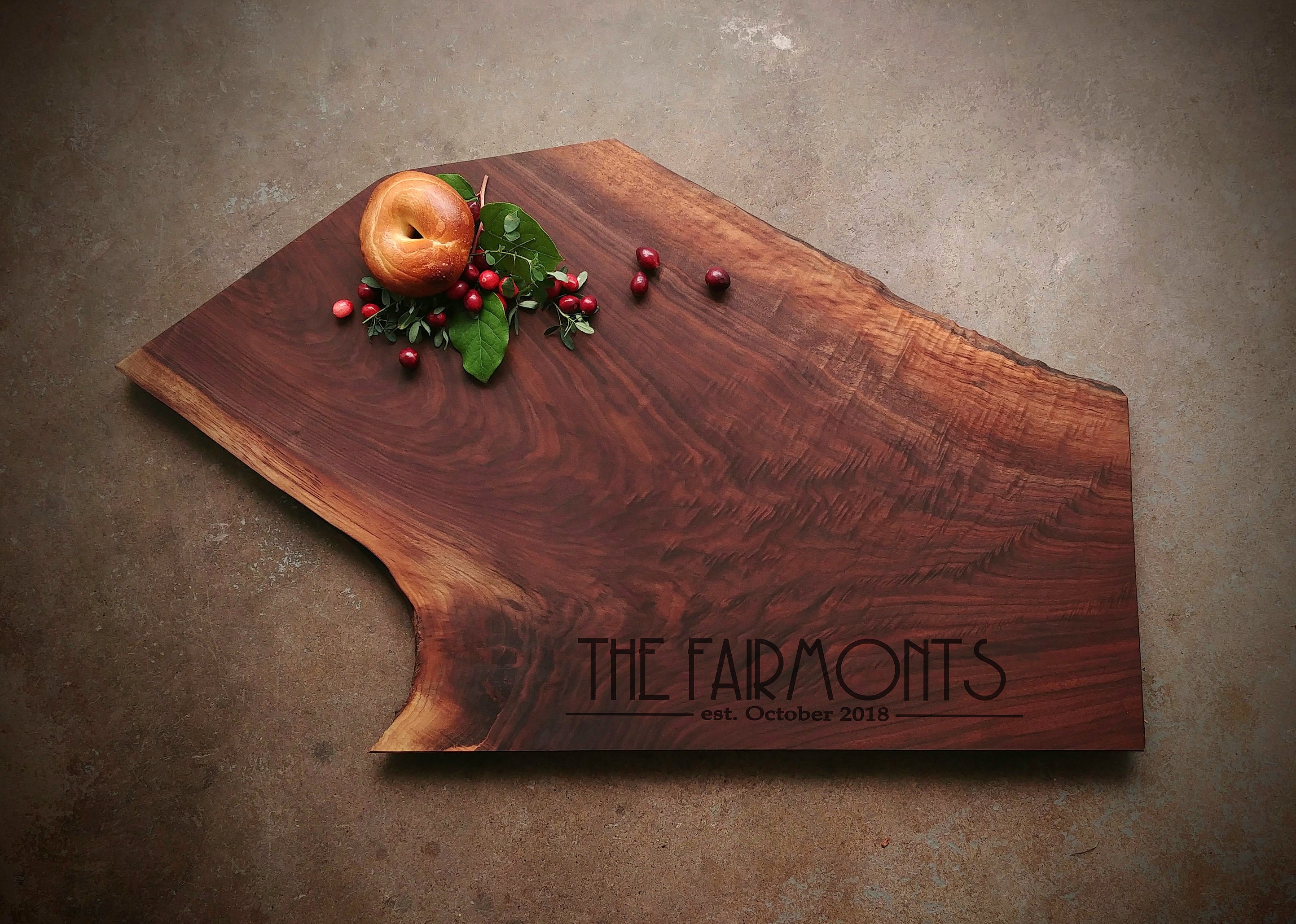 EXTRA LARGE PERSONALIZED LIVE EDGE BLACK WALNUT CUTTING BOARD with FEET and OSO WOOD BUTTER shown with photoshopped ART DECO NAME and DATE design. We can substitute with any laser engraved personalization of your choice (see our other personalized board examples for ideas).