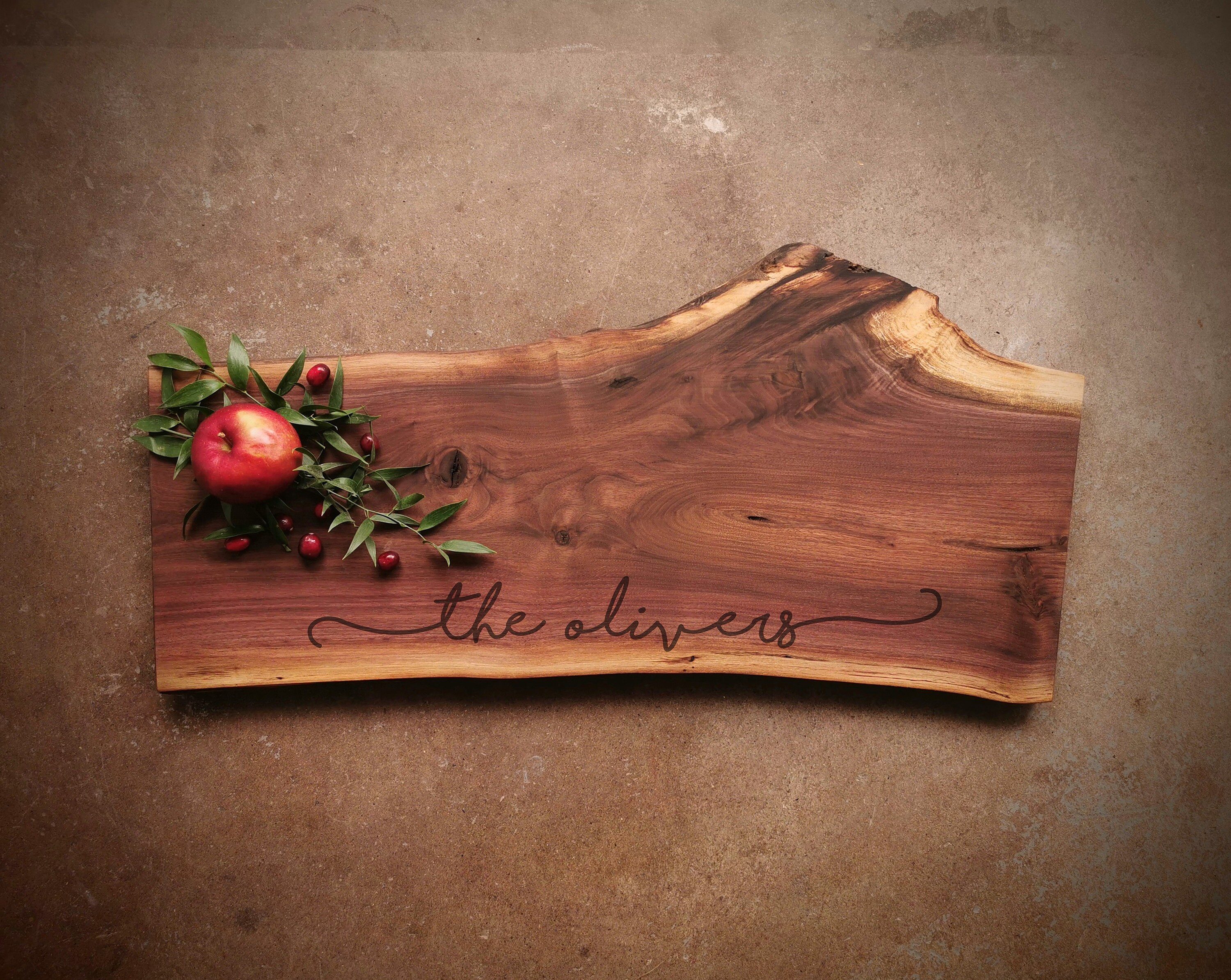 LARGE PERSONALIZED LIVE EDGE BLACK WALNUT CHEESE BOARD with FEET and OSO WOOD BUTTER shown with photoshopped FAMILY NAME in SHORELINE SCRIPT design. We can substitute with any laser engraved personalization of your choice (see our other personalized board examples for ideas).